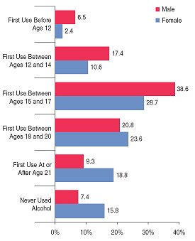 Among adults aged 21 or older, females were more than twice as likely as males to report having never used alcohol (16 vs. 7 percent) (Figure 1). Males (83 percent) were more likely than females (65 percent) to report having initiated alcohol use before age 21. Males also were more likely than females to report having first used alcohol before age 15 (24 vs. 13 percent).