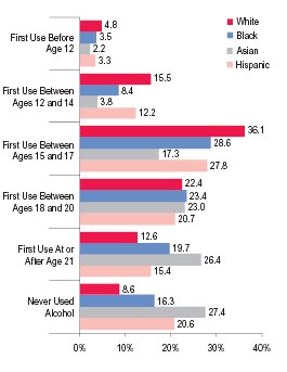 Figure 2. Percentages of Age at First Alcohol Use among Adults Aged 21 or Older, by Race/Ethnicity: 2003 |
