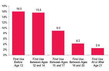 Among adults aged 21 or older who initiated alcohol use before the age of 21, the rate of past year alcohol dependence or abuse was 9 percent. Among the 14 million adults aged 21 or older who were classified as having past year alcohol dependence or abuse, more than 13 million (95 percent) had started using alcohol before age 21. Only 5 percent (fewer than 1million persons) of adults classified as having past year alcohol dependence or abuse had started using alcohol at or after age 21.