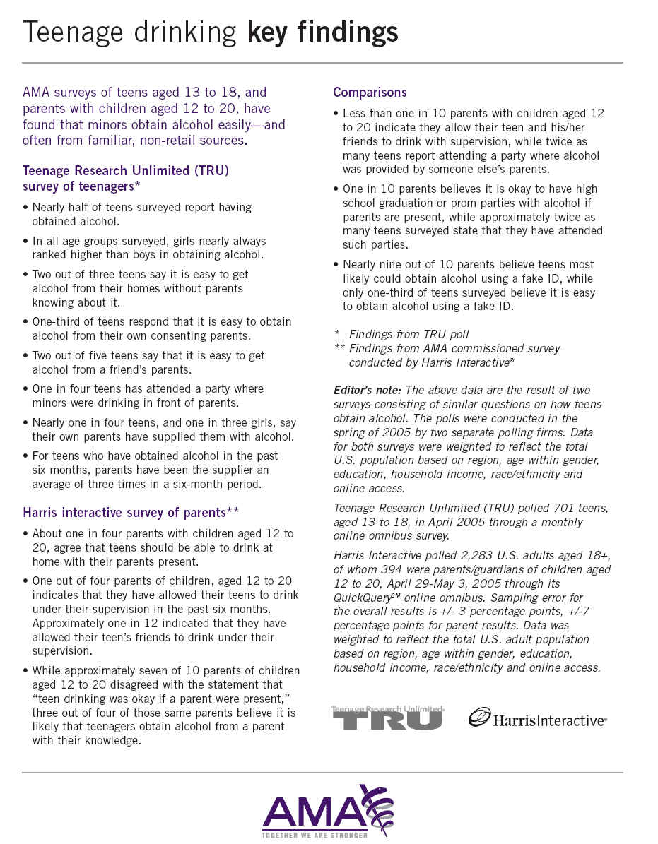 The Marin Institute, an alcohol industry and policy watchdog, is calling for a nationwide, community-based response to our country's underage drinking epidemic in light of two polls released today by the American Medical Association. By revealing "... how underage youth obtain alcohol, as well as how easily and often," the AMA's findings highlight the need for parents, physicians, policy makers and businesses to help create community conditions that prevent youth access to alcohol.